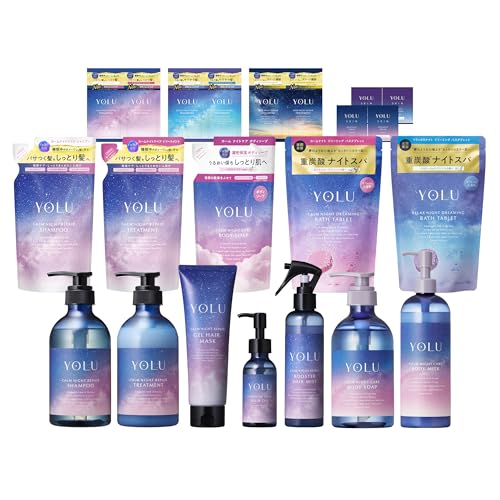 2026年福袋YOLUシャンプー・トリートメントセット、アウトバス・ボディケア・バスタブレット・スキンケアの16点入り。カームナイトリペアを含むWEB限定商品です。