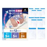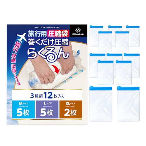 収納のプロと元CAが監修した、くるんと巻くだけで簡単に圧縮できる圧縮袋セット。M×5枚、L×5枚、XL×2枚の合計12枚。道具不要で、出張や旅行、引っ越し時の収納に便利です。