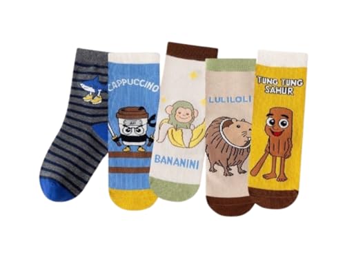 トゥントゥントゥンサフールのキッズソックス5足組は、公式キャラデザインで、綿混通気素材を使用。男女共用で、幼稚園・小学校用の毎日履き替えに最適なXLサイズ。