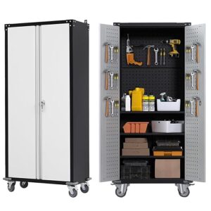 ツールキャビネット ロッカー スチール製 扉タイプ 幅80*奥行き41*高180cm ツール 大型 ロールキャビネット スチール書庫 キャスター付き 可動棚付き ロック付き 有孔ボード付き 鍵付き DIY (グレー+ブラック)