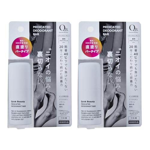 QB(クイックビューティ)の薬用デオドラントバーは、20gのスティックタイプで、制汗・消臭・殺菌効果を持つ医薬部外品です。わきがや足臭、体臭対策に最適で、男女や子供にも使えます。日本製で、肌に優しくサラサラ感が持続します。