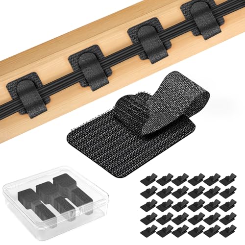 無痕・繰り返し使えるケーブルクリップ30個セット。電源コードやLANケーブルを壁に這わせて整理。リビング、キッチン、オフィスに最適なブラックのT型デザイン。