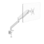 モニターアームは12-32インチ対応で、ガススプリング式クランプ・グロメット式。耐荷重2-9kgで多角度調整可能。ケーブル収納機能付きで省スペース。オフィスに最適なホワイトのシングルアーム。