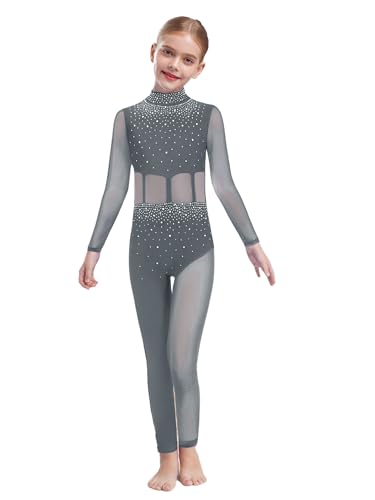 [Chaoyinn] 子供用の女の子向け きらきらしたメッシュのパッチワーク 全身用の体操レオタード フラッシュダイヤモンド柄 長袖 フィギュアスケート用ジャンプスーツ グレー 12の高価買取