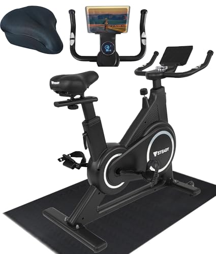 STEADY スピンバイク Plusは、Zwiftやアプリと連動可能で、静音設計。組立も簡単で家庭用に最適。エアロバイクとしての性能を備え、ブラック色でスタイリッシュ。サドルカバー付きで快適なトレーニングをサポート。