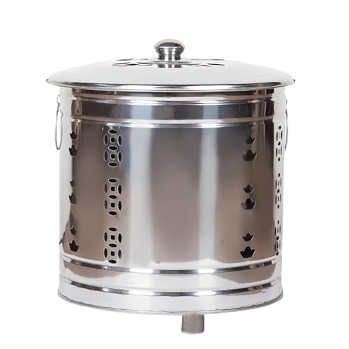MORLU家庭用焼却炉は、30*30cmのサイズで、ドラム缶型デザインが特徴です。蓋とハンドル付きで、安全に紙や落ち葉、木ゴミを燃やせます。シルバーの色合いが美しく、寺院でのお経焼きにも適しています。