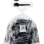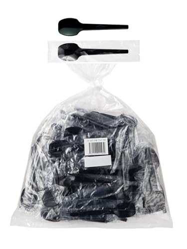 ストリックスデザインの使い捨てミニスプーン(日本製)は、業務用として100本入り、長さ10cmでブラックカラー。個包装されており、試食やデザートに最適です。
