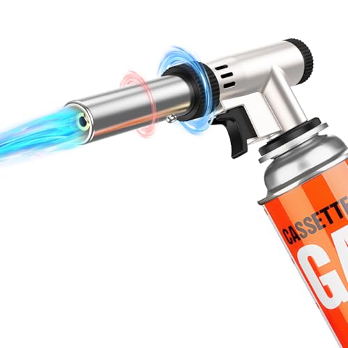 DIKKDZのトーチバーナーは900℃から1300℃まで調整可能で、料理、炙り、BBQなど多用途に対応。逆さ使いもでき、風防付きで安全。小型設計で持ち運びに便利ですが、燃料は別売りです。