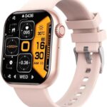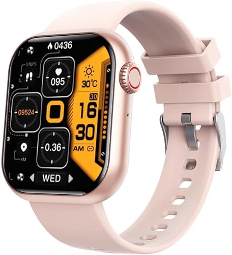 高齢者向けピンクのスマートウォッチ。大きな文字表示、心拍数モニタリング、緊急通報機能搭載。簡単操作で健康管理をサポート。防水機能あり、デザインも可愛らしい。