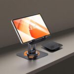 360°回転可能な折り畳み式タブレットスタンド。高さと角度調整が可能で、滑り止め機能により安定性抜群。iPad、スマホ、Switchなど多機種に対応し、コンパクトな人間工学設計。