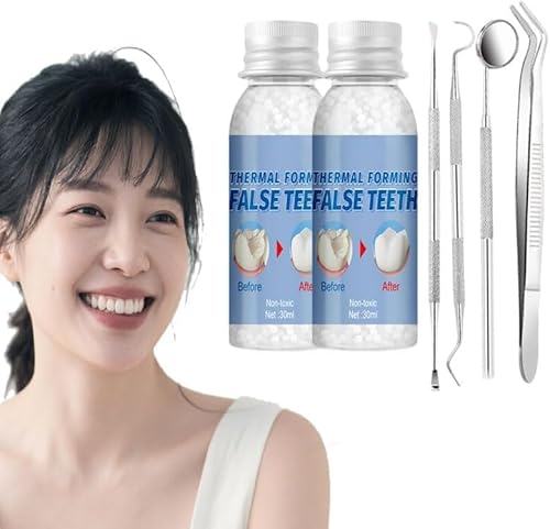 本製品は、入れ歯修理用の歯科用セメントと接着剤を含むキットです。欠けた歯の応急処置や、一時的な義歯交換に最適で、DIY用のサーマルフィットビーズ(60ml)も含まれています。