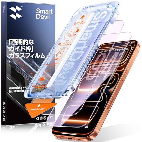 SmartDevilのiPhone17 Pro Max用ガラスフィルム2枚セット。ブルーライトカットで目に優しく、ガイド枠付きで貼り付け簡単。米軍MIL規格の耐衝撃性を持ち、指紋防止機能も備えています。