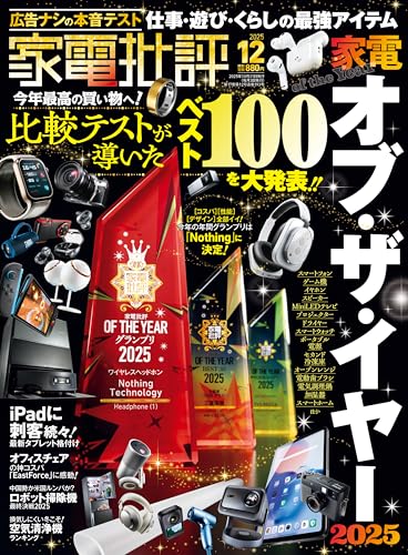 2025年12月号の家電批評では、厳選された最新家電製品が紹介されています。特集には家電オブ・ザ・イヤー2025の受賞製品が並び、革新的な機能やデザインが評価されています。