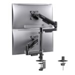 ErGearモニターアームは、13-32インチのデュアルモニターに対応し、耐荷重9kg。ガススプリング式で角度調整可能、VESA規格(75x75mm、100x100mm)対応。クランプ式/グロメット式で配線収納も簡単。