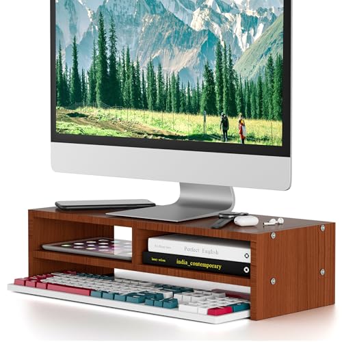 Qecamy モニタースタンドライザー 収納付き 2段デスクオーガナイザー デスクトップ木製棚 人間工学に基づいたコンピュータースタンド ノートパソコン PC プリンター用 16インチ 小型テレビライザー 耐荷重50ポンド ウォールナットブラウンの高価買取