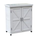 小型の木製収納庫で、屋外に最適な天然杉製。防水性があり、観音開きで使いやすく、棚板付き。ガーデンシェッドや倉庫としても利用可。オフホワイトのデザインが特徴。