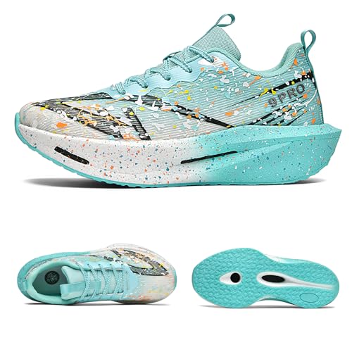 カーボンプレート搭載のランニングシューズ。耐久性があり、ソフトクッションで快適。厚底デザインで軽量、通気性も良好。13歳以上の男女に対応。