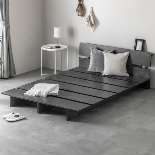 モダンデコのダブルベッド(宮棚・コンセント付き)は、幅160cmで収納力抜群。ロボット掃除機対応のすのこベッドで、ロータイプの北欧デザイン(モルタルブラック)。