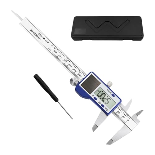 アップグレード版のソーラーパワードデジタルノギス。150mmの測定範囲で、ダブル電源対応。機械工学用に設計され、防水機能付き。収納ケースも付属。