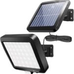 ソーラーライトは屋外用の56LED、高輝度の防犯照明です。IP65防水で人感センサーが搭載され、5Mケーブル付き。駐車場や玄関、庭先で使えます。太陽光発電により、自動で点灯します。