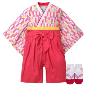[SLINX] ベビー服 袴 ロンパース 袴ロンパース 袴セット 着物 和装 女の子 フォーマル 赤ちゃん お食い始め お宮参り 百日祝 初節句 和服ロンパース カバーオール 靴下付き ベビー キッズ 袴風 出産祝い ベビー袴 HF7301 (80, 菊レッド)