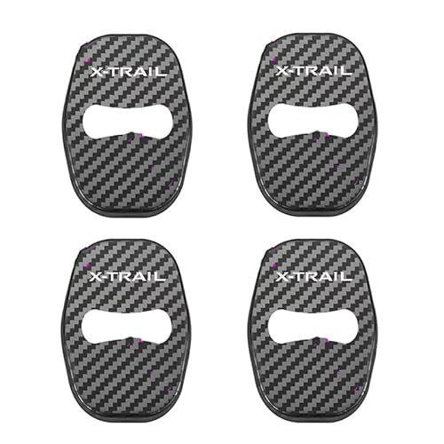 エクストレイル用のドアストライカーカバー。鏡面ステンレス製で錆防止メッキ仕様。簡単取り付けでカスタムロゴ付き。4個セットのカーアクセサリー。