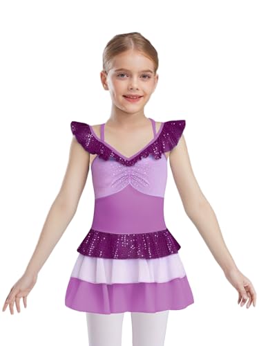 子供用女の子向け、きらきらしたマーメイド柄のフィギュアスケート用ドレス。袖なし、段違いのリボン付きで、バレエダンス用チュチュスカートとしても使用可能。色は紫、サイズは16。