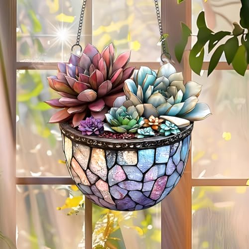 多肉植物を飾るアクリル製サンキャッチャーです。18.04cmの吊り下げデザインは、ウィンドウ装飾やウォールアートに最適。ステンドグラススタイルで、屋内外で使用可能。ガーデンオーナメントやギフトにもおすすめ。