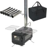 この薪ストーブはキャンプ用に最適で、耐熱塗装が施されています。3面のガラス窓から炎が見え、煙突付きで換気も良好。底網が付いており、クッキングにも便利です。