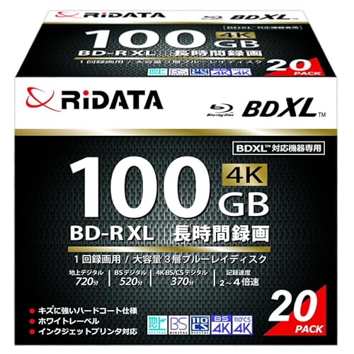 RIDATA製のBD-R XLは、1回録画用のブルーレイディスクで、容量は100GB。2-4倍速での書き込みが可能で、ホワイトプリンタブル仕様。片面3層構造で、20枚のスリムケース入りです。
