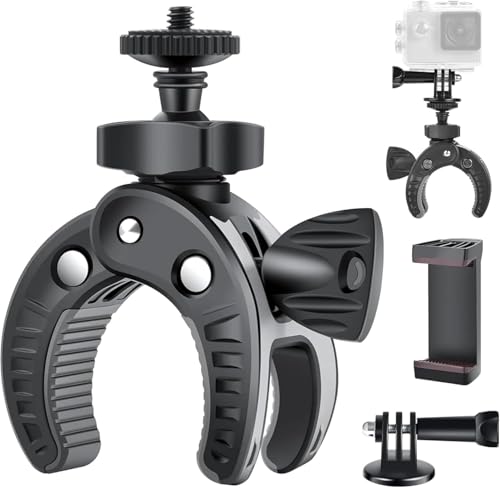 UTEBIカメラマウントは、バイク用で開脚幅最大45mm。耐荷重0.7kg、スマホクリップ付き。1/4ネジシューで360度回転可能。アクションカメラや一眼レフに対応。
