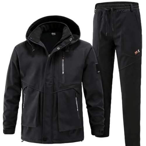 ウインドブレーカー メンズ上下セット。裏起毛で保温性抜群のマウンテンパーカー・ジョガーパンツ。多機能ポケット付きで作業やアウトドアに最適。フード付きでバイクやスキーにも対応。サイズL、色はブラック。