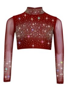 子供用女の子向け、きらきらするジャズラテンダンス用の短めトップ。カラーブロックデザインでリリカルバレエやフィギュアスケートにも適したシャツ。ロイヤルブルー、サイズ6展開。
