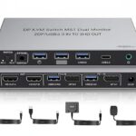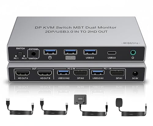 デュアルモニター対応のKVMスイッチ。2コンピューターを4K 60Hzで接続し、USB 3.0ポートで周辺機器も共有可能。1セットでキーボード、マウス、プリンターが利用できます。