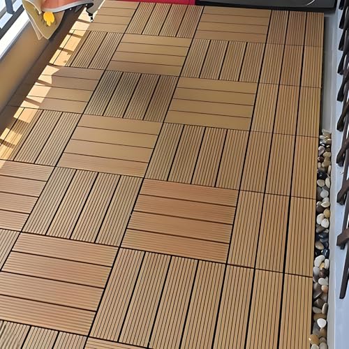 ウッドデッキ用の人工木材の置くだけウッドパネル。11枚セットで、ジョイントタイルとして使用可能。ベランダやガーデンに最適で、簡単に施工できます。耐水性、耐候性にも優れています。