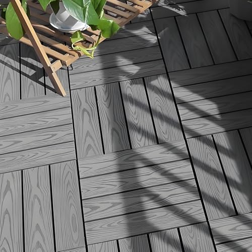 ウッドデッキに最適な人工木材のジョイントタイル。サイズ30x30cm、11枚セットで、簡単に設置できるため、ベランダやガーデンの屋外空間を手軽におしゃれに演出できます。