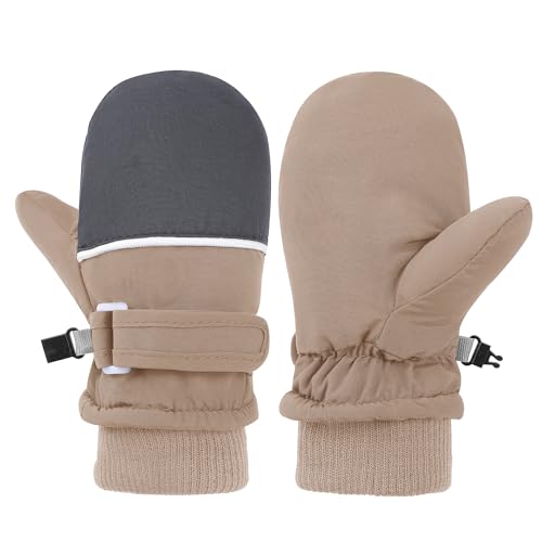 防水スキーグローブキッズ用。コットン素材でやわらかく、肌に優しい。サイズはS(6ヶ月~2歳)で、片手サイズは25×18×1mm。カーキ色で男の子・女の子どちらにも適しています。