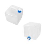 Umemigusaの20L折りたたみウォータータンク2個セット。蛇口付きで給水便利、アウトドアや防災に最適なキャンプ用品です。軽量で持ち運びやすいデザイン。