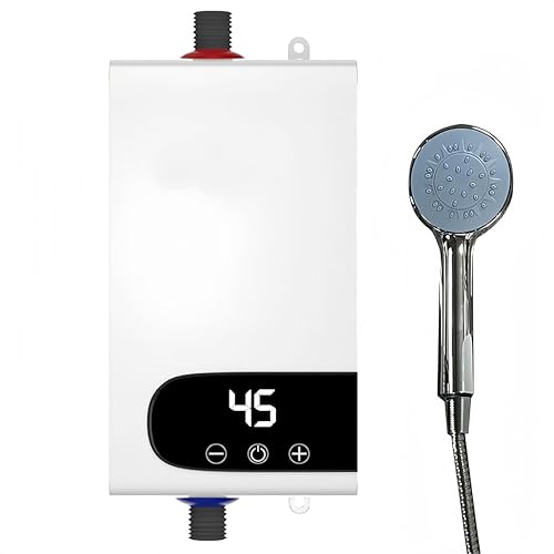 3500W 110Vのタンクレス電気給湯器は、シャワー用の即時温水を提供します。デジタルディスプレイ付きで、簡単操作。RVやバスルームに最適なポータブルデザインです。