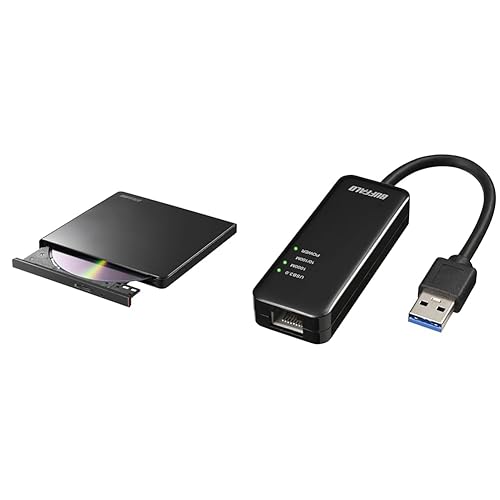 バッファローのポータブルDVD/CDドライブはUSB2.0対応、コンパクトで使いやすい。付属の有線LANアダプターはGiga Type-A、USB3.2(Gen1)に対応し、高速データ転送が可能。