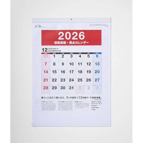 ムトウユニパック MU-002 情報満載満点カレンダー 2026年は、壁掛け型の五暦5ヶ月カレンダーです。多彩な情報が収録されており、使い勝手が良いデザインが特長です。
