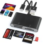 4イン1メモリーカードリーダー。SD/MicroSD/MS/XDに対応。Sony Cybershot用のアダプター。Lightning/USB-C/USB-A接続可能。iPhone/iPad/PC/Android対応。