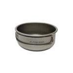 TITAN MANIAクッカーはチタン製で400mlから1200mlまでのセット。全てスタッキング可能で軽量、耐久性に優れ、直火使用可。折りたたみハンドル付き。キャンプやアウトドアに最適な収納袋付き。