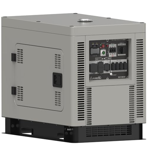 Kareyouのディーゼルインバーター発電機 DH18KiEは、13.2kVAの出力を持ち、低燃費で長時間運転が可能。工場や建設現場、防災用のバックアップ電源に適した防音型設計です。