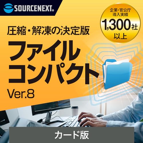 ソースネクストの「ファイルコンパクト Ver.8」は、Windows対応の圧縮・暗号化ソフトです。大容量ファイルの圧縮や、データの安全な暗号化が可能です。カード版で手軽に入手できます。