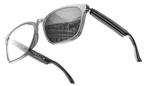 Bluetooth 5.4対応のスマートグラス。変色調光、ワイヤレスオーディオ、オープンイヤー設計。内蔵マイクで音楽通話も可能。UV400とブルーライトカット機能付き。付属品は本体、充電ケーブル、取扱説明書、布、キャリーバッグ。