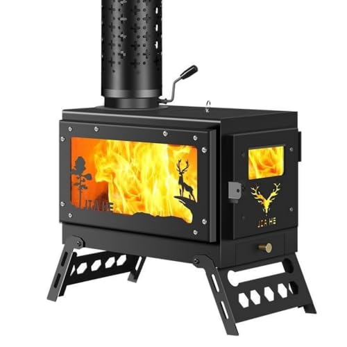 Foke薪ストーブは、2次燃焼機能と高熱効率を備えた大型ストーブです。耐熱ガラスや耐熱塗装が施され、1200℃まで対応。リビングや寝室に適し、煙突付きで無煙ヒーターとしても使用可能。サイズは43*39*26cm、鉄製でキャンプにも最適。