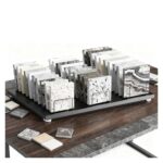 小型卓上タイルディスプレイラック。ショールームやイベント向け。省スペース設計で、サイズはL-50CM(19.7IN)。多スロットで建築材料サンプル展示に最適。色はブラック。