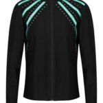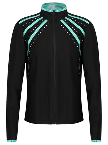 Raenseenの子供用フィギュアスケート用長袖モックネックボンバージャケットは、速乾性のある青緑色のトラックジャケットです。快適さとスタイルを兼ね備え、体育に最適です。サイズは14があります。
