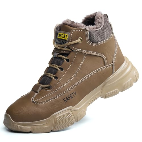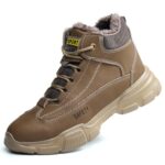 防寒安全靴は防水・寒冷地仕様の作業靴で、軽量ハイカット設計。裏起毛で暖かく、樹脂先芯入りで踏み抜き防止。滑らず電気を通さず、耐熱・耐火性能を持つ。サイズ23.5cmのブラウン。